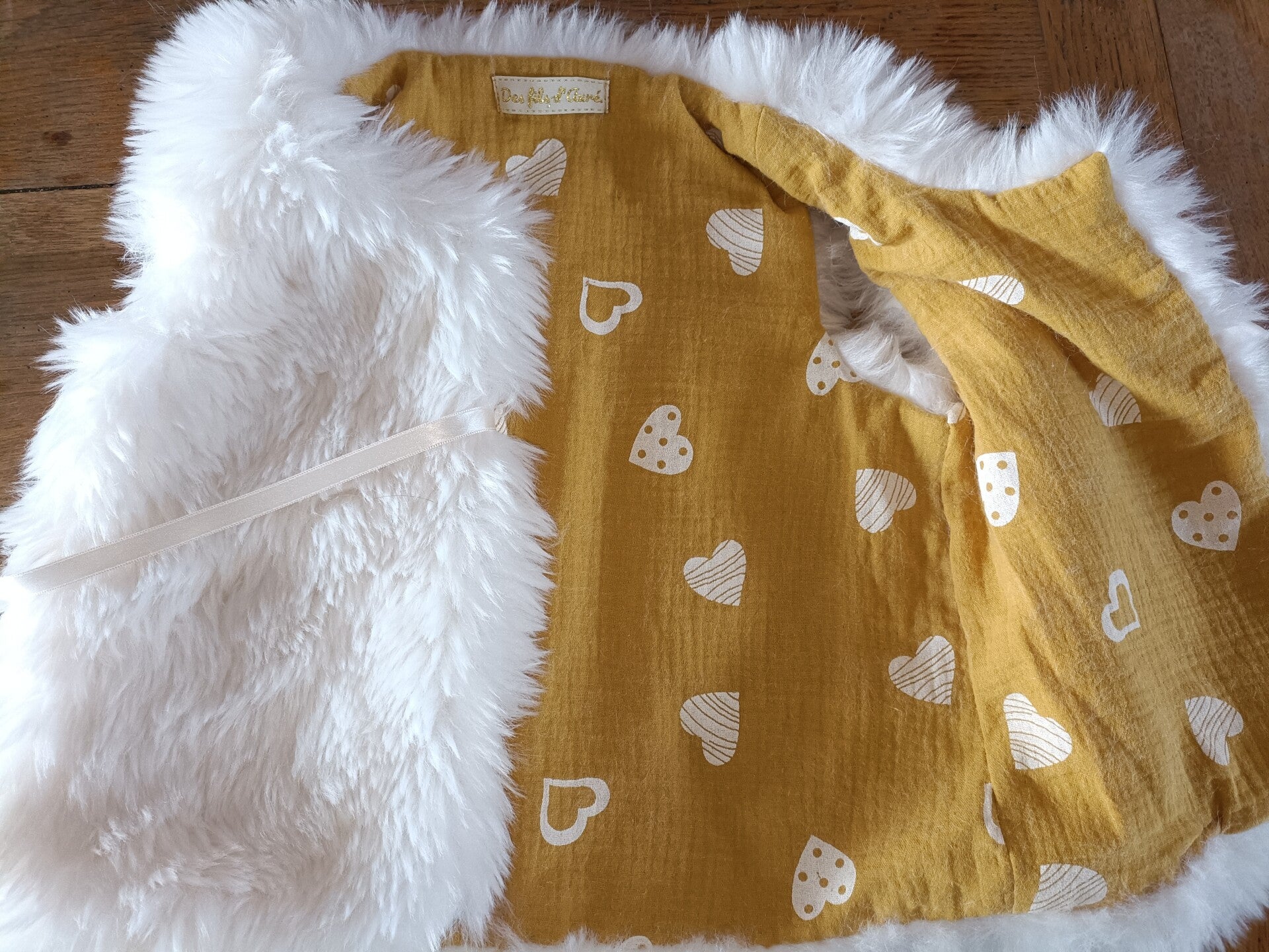 Ce gilet de berger réversible ajoutera une touche d'élégance aux tenues de vos enfants tout en les gardant au chaud. En fausse fourrure ( poils courts ou longs) toute douce et coton (popeline, double gaze,...). Le lien satiné permettra à votre enfant de le fermer.
